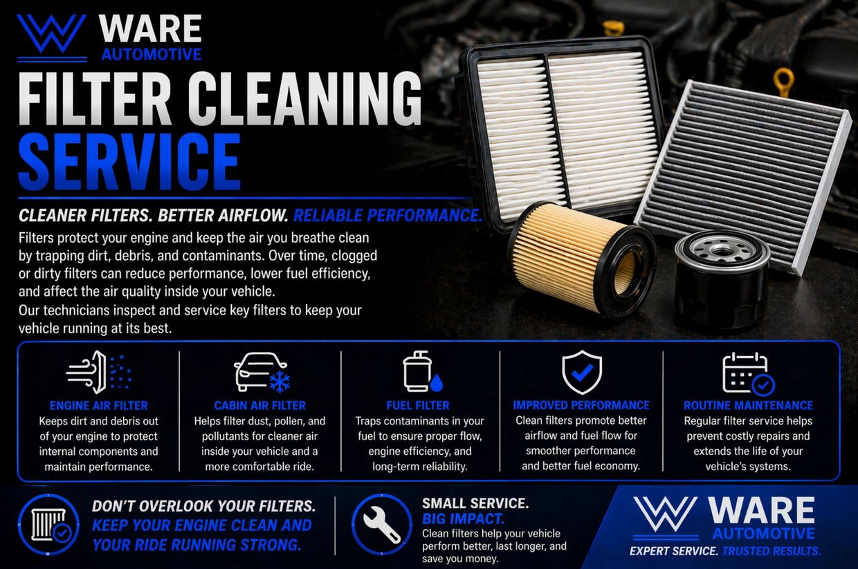Keep your vehicle running clean and efficiently with professional filter cleaning and replacement services from Ware Auto Care. Filters play a vital role in protecting your engine and maintaining air quality by trapping dirt, debris, and contaminants before they can cause damage.