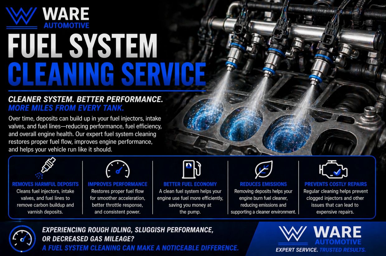 Keep your engine running efficiently with professional fuel system cleaning from Ware Auto Care. Over time, deposits can build up in your fuel injectors, intake valves, and fuel lines—reducing performance, fuel efficiency, and overall engine health.