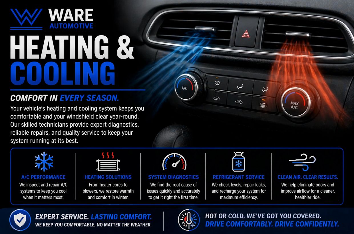 Stay comfortable on the road year-round with expert heating and cooling services from Ware Automotive. Your vehicle’s climate control system plays a critical role in both comfort and safety—keeping you cool in the summer, warm in the winter, and your windshield clear in all conditions.