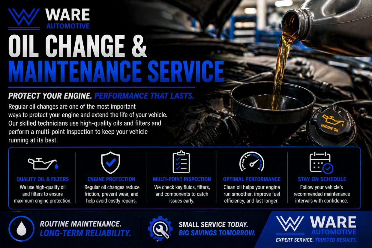 Keep your engine running smoothly with routine oil change and maintenance services from Ware Auto Care. Regular oil changes are one of the most important ways to protect your engine, improve performance, and extend the life of your vehicle.