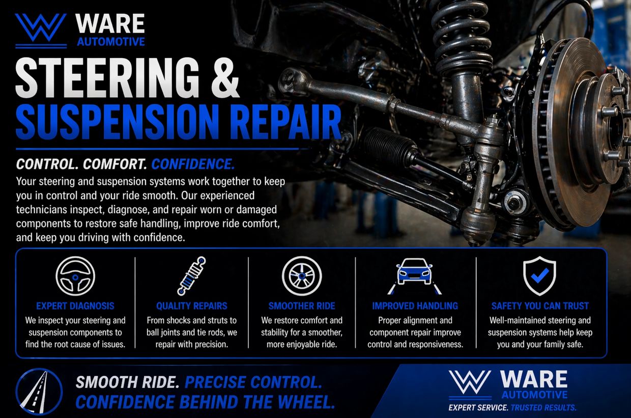 Enjoy a smooth, stable ride with expert steering and suspension services from Ware Automotive. These systems are essential for maintaining control, comfort, and overall safety—especially when navigating turns, uneven roads, or sudden stops.